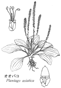 | 漢薬名は葉を「車前草」、種子を「車前子」といい日本薬局方という公定書の医薬品の第2部に収載されている医薬品です。 オオバコは繁殖力が非常に強く至る所に生えています。 私が子供の頃、繊維質の花茎を絡ませて引っ張り合い勝ち負けを競い遊びをしました。 種子は水分がつくと粘液質に被われてズボンや靴や動物などに付きます。乾くと種子が落ちるので広範囲に繁殖します。 穂の黒褐色の小さな種子は紙の上で軽く叩いて集めます。この種子を粉末にした物は水に触れると膨張します。 飲むと満腹感が得られるのでダイエットとして一時期流行しましたがいまでは余り見向きされなくなりました。 ◆種子は咳止めに使います。1日10gほどを煎じて飲みます。煎液は少し粘稠性があります。 ◆地上部(主に葉)は利尿作用があり軽い浮腫や、種子と同様に咳止めに使います。生の葉は軽く炙って柔らかくなった物をオデキなどの腫れ物に貼り付けます。 オオバコは日本各地で多種多様につかわれます。例えば咳止め、下痢止め、膀胱炎や浮腫の利尿、眼病、健胃、便秘。地方によっては解熱、関節痛、心臓病、肋膜炎にも利用されているそうです。 多くの方言名もあります。オンバコ、オバコ、ギャーロッパ、カエロッパ、ゲェーロッパ、マルバ、テリコバコ、スモウトリグサなどです。 内服する時には葉は流水でよく洗って陰干しします。種子はそのまま乾燥させます。農薬には注意の事。 ョ情報提供、長岡孝実「漢方薬局一貫堂」 g26-2620、ホームページ http://ikkando.com |