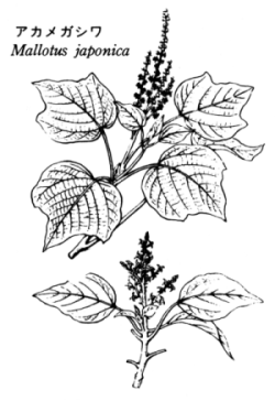 | 身近にある薬用植物20 「アカメガシワ」赤芽槲(赤芽柏) トウダイグサ科Euphorbiaceaeの雌雄異種株の植物です。漢薬名は野梧桐といいます4月から5月頃の若葉は赤く成長するにつれて緑色になるのでこの名があります。6月頃に花をつけます。雄花・雌花と花の違いも楽しめます。昔はこの葉で食べ物を包んだり盛ったりしていました。別名に盛菜葉、五菜葉とあるのはこのためです。薬用には葉や樹皮を使います。夏場に葉や樹皮を採取し乾燥させ、薬用とします。明治以前は「切らずに腫れ物を治す薬」として用いられました。近年、専門家の研究で、胃の腫れ物や胃潰瘍にたいして、ある程度の効果があることが確かめられました。現在では赤芽槲から治療薬が製造販売されています。 (1).胃潰瘍をはじめ十二指腸潰瘍・胃酸過多症・胃腸病には1日10〜20gを水500MLでとろ火で約40分で半量に煎じて1日3回食後に飲みます。 (2).胆石症には葉10g、樹皮5gを水700`で半量に煎じて飲みます。 (3).腫れ物や痔には葉を煎じて内服および外用として患部を洗います(胃潰瘍の要領で煎じます)。 (4).皮膚病や神経痛・リウマチには煎じた液を風呂に入れて入浴する良いです。成分にタンニンを含むので金属製の器は用いないでください。 資料提供、長岡孝実、漢方薬局一貫堂 ●情報提供、長岡孝実「漢方薬局一貫堂」 g26-2620、ホームページ http://ikkando.com |